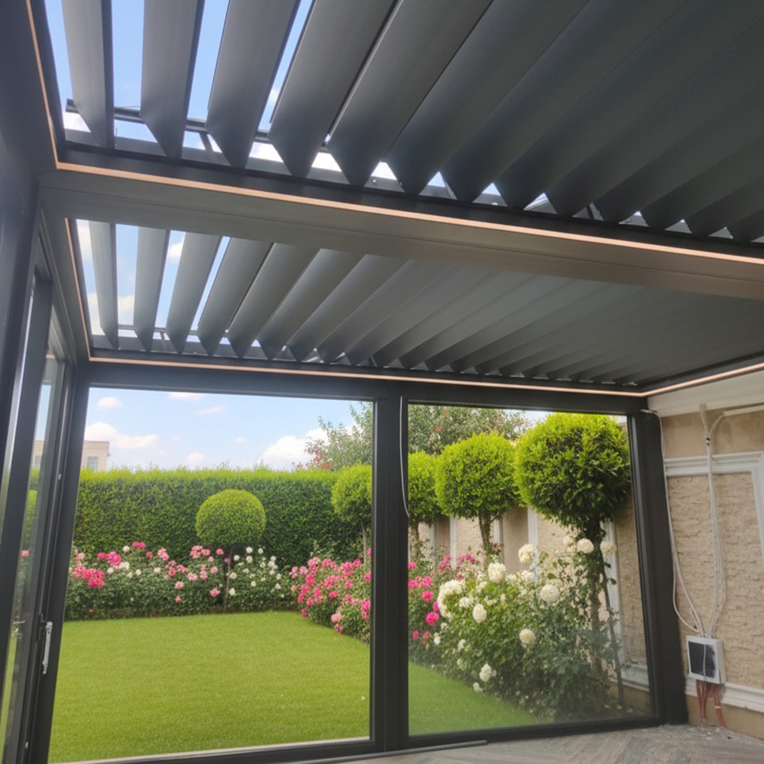 Estetik tasarımı ve yüksek dayanımlı alüminyum yapısıyla dış mekânları dört mevsim kullanılabilir hale getirir. Hareketli tavan panelleri sayesinde güneş ışığı, rüzgâr ve yağmur koşullarına göre otomatik olarak ayarlanarak ideal iklimlendirme sağlar. Giyotin cam, zip perde, sürme sistem ve LED aydınlatma entegrasyonu ile modern yaşam alanlarında konforu ve fonksiyonelliği bir araya getirir. Kafe, restoran, teras ve konut gibi alanlarda şık görünümüyle mekânlarınıza prestij ve değer katar.
