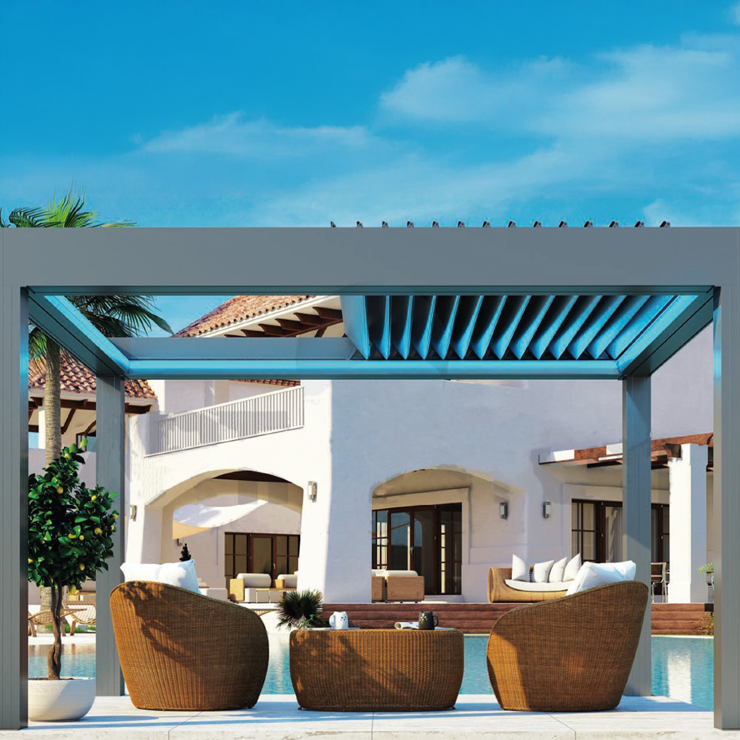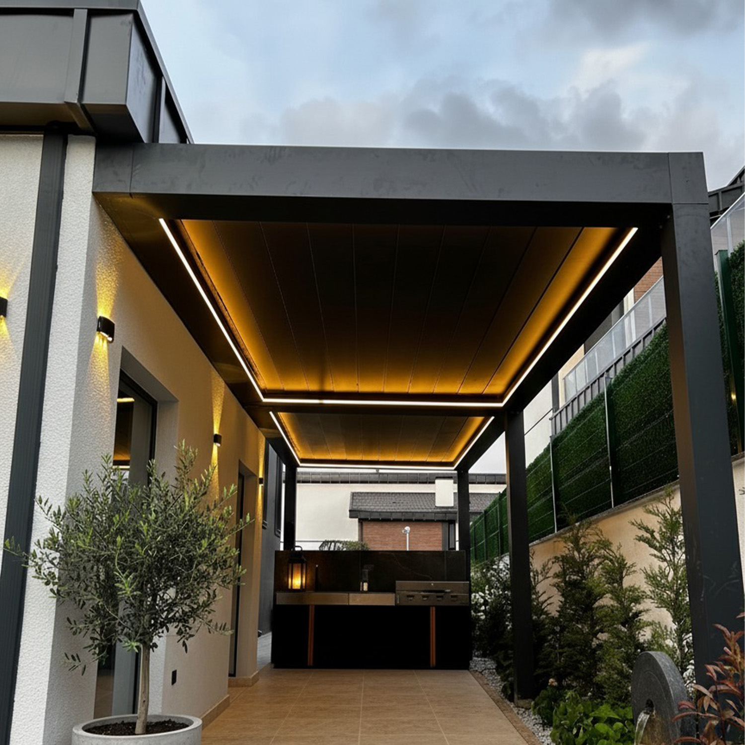 Modern mimari anlayışla tasarlanmış, alüminyum yapısı ve hareketli tavan panelleriyle dört mevsim kullanılabilir konforlu alanlar oluşturur. Güneş ışığı, rüzgâr ve yağmur koşullarına göre otomatik olarak ayarlanabilen sistemi sayesinde doğal iklimlendirme sağlar. Giyotin cam, zip perde, sürme sistem ve LED aydınlatma gibi opsiyonel bileşenlerle entegre çalışarak estetik, dayanıklılık ve fonksiyonelliği bir araya getirir. Kafe, restoran, teras ve konut gibi alanlarda zarif görünümüyle yaşam alanlarınıza modern bir dokunuş katar.